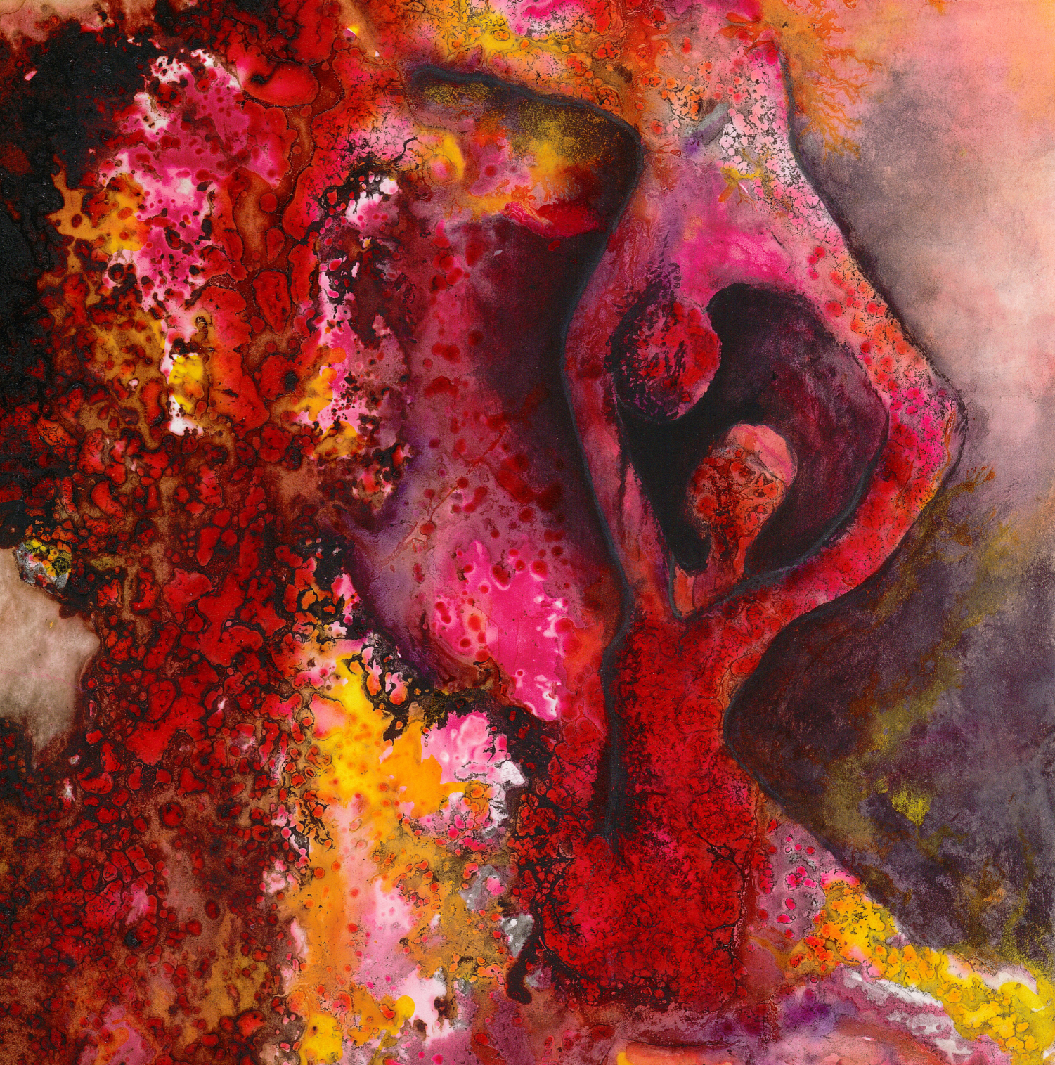 This painting was made with ink and acrylic on A3 paper. It comes framed in a white plastic frame (40x50 cm) with white matting.